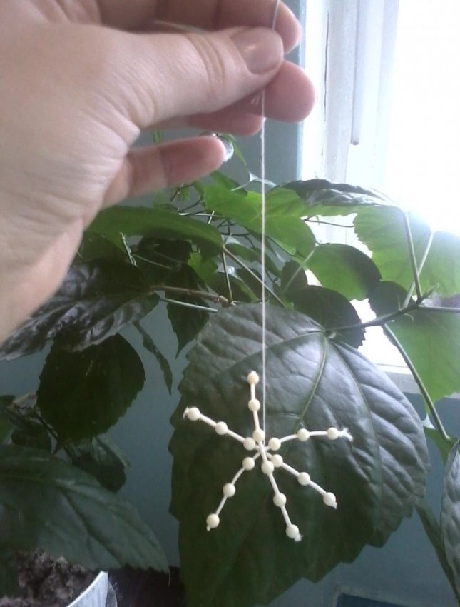 Из тонкого шнура нарезать отрезки по 4 шарика. Этот шнур обвисает, лучики получаются не прямыми, а дугообразными. Чтобы снежинка имела красивый вид, возьмем 4 отрезка –получится 8 лучиков. А из 3 отрезков – 6 лучиков – получается вялый жидковатый паучок.