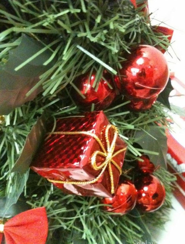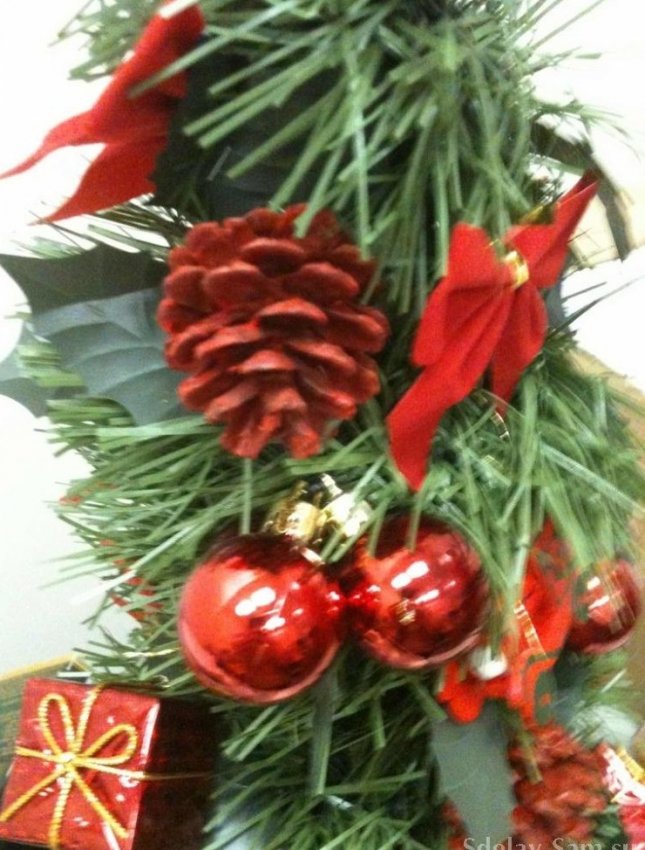 3. Берем мишуру, можно взять любого понравившегося Вам цвета. Я не могла пройти мимо мишуры в виде искусственной ели,поэтому выбрала ее. Она изначально уже была украшена красными шариками.