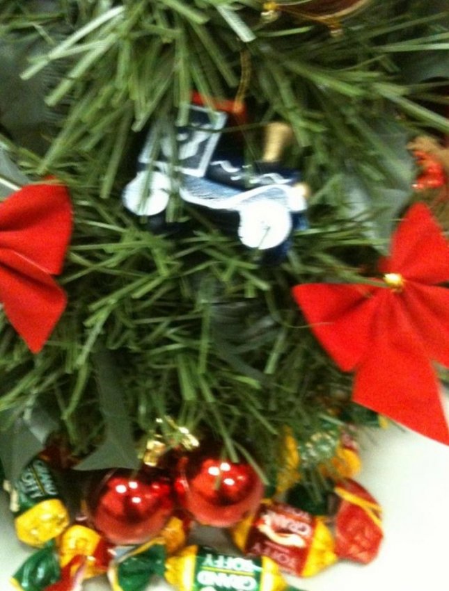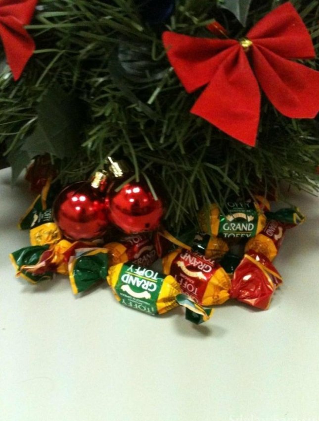 7. Для маскировки пространства и скотча укладываем под елку конфетки. Последняя фотография была сделана после нового года, когда конфетки были съедены коллегами) Положили мишуру)