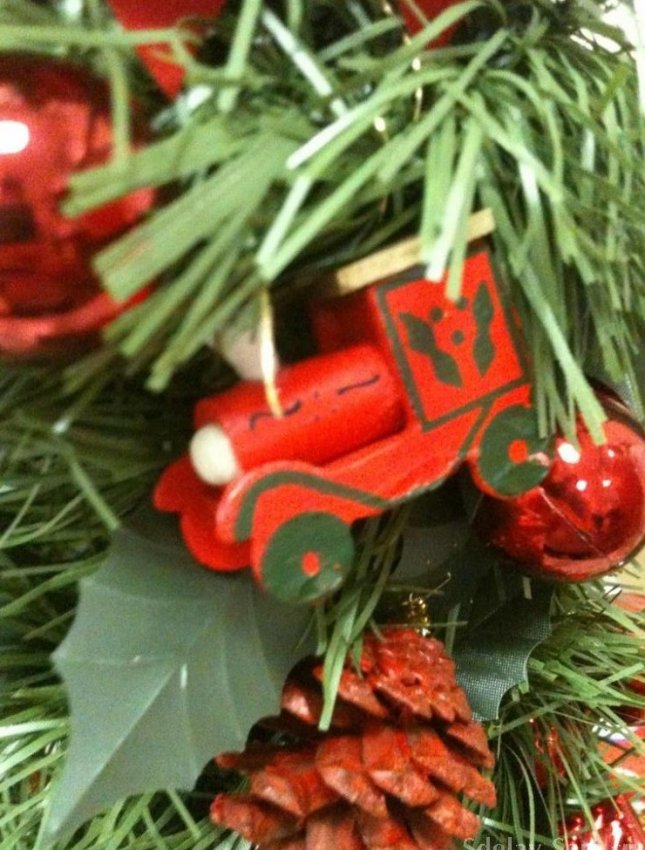 4. Когда основа полностью готова, начинаем вешать игрушки. Игрушки можно выбрать любые, а также можно украсить ель конфетами. Я выбрала миниатюрные подарки, барабаны, паравозики, бантики, шишки и снеговиков. Их можно или привязать на существующие у них веревочки или закрепить степлером. Я привязывала, но особо отваливающиеся я скрепляла с листочками на мишуре.