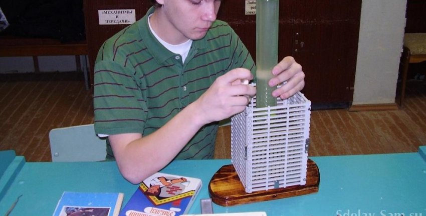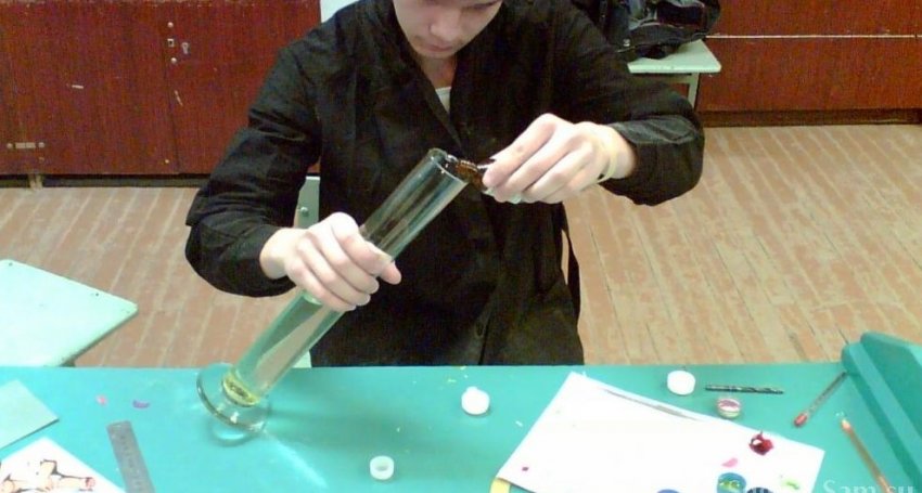 Вверху сосуда надо оставить небольшое пространство, которое заполнится при расширении жидкости от нагревания. Если жировая жидкость сразу всплывает, измените плотность жидкости на водной основе, добавляя спирт. Испытайте, работает ли лампа, нагревая дно сосуда. Если надо, добавьте еще спирта или воды (добавление спирта ведет к уменьшению, а воды - к увеличению плотности водного раствора). Когда лампа будет работать удовлетворительно, крышку плотно (на клею) закупорьте.