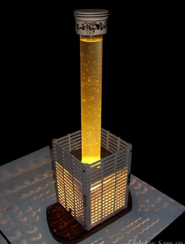 Теперь остается собрать все части, вставить стеклянный сосуд в основание и, наконец, включить "волшебную лампу".