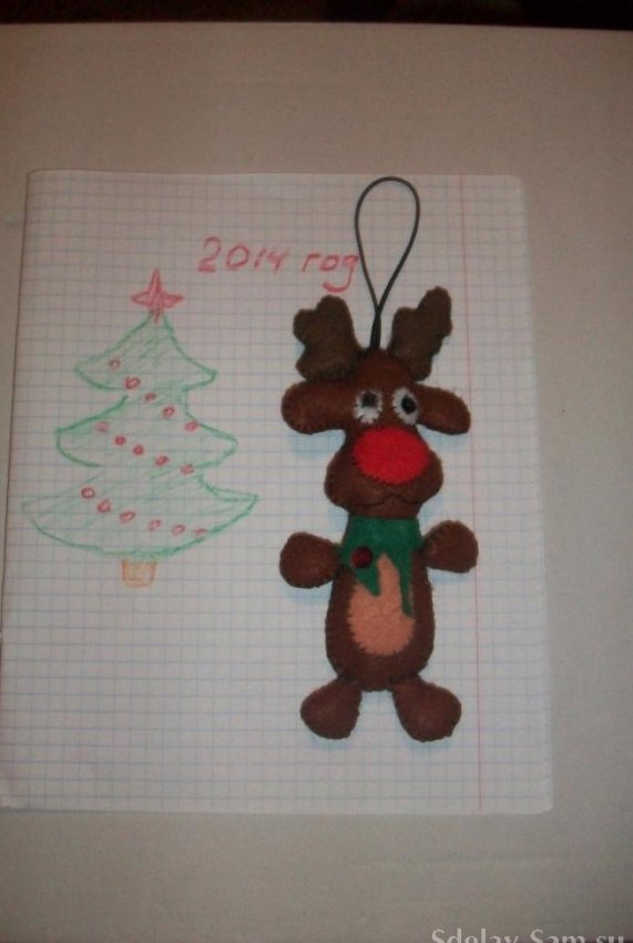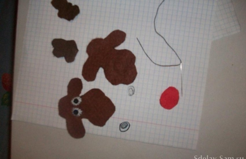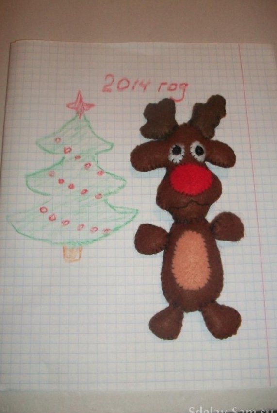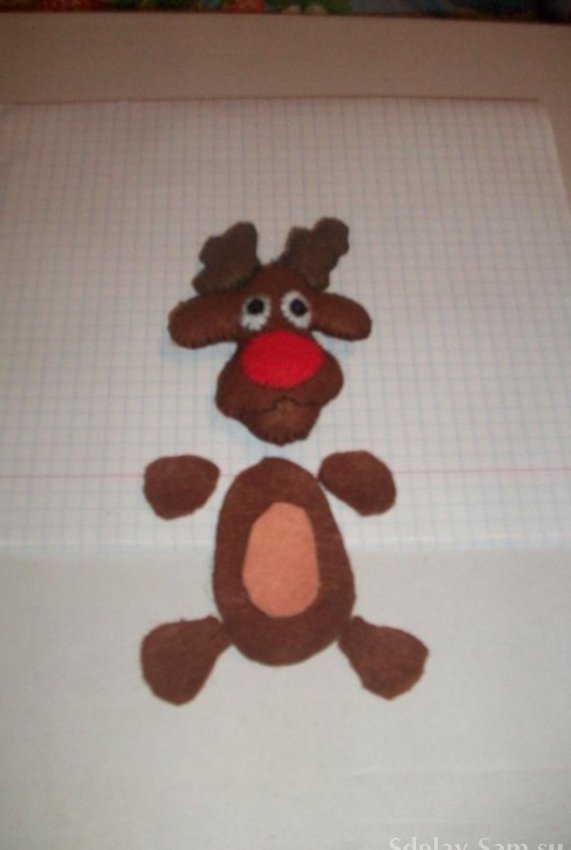 Вот такой олень послужит нам схемой для будущей работы. Вырезаем детали бумаги. Обрисовываем на фетре и вырезаем. Готовые детали примеряем.