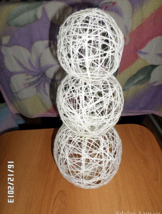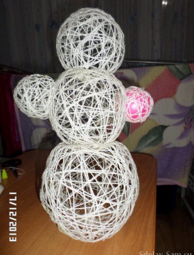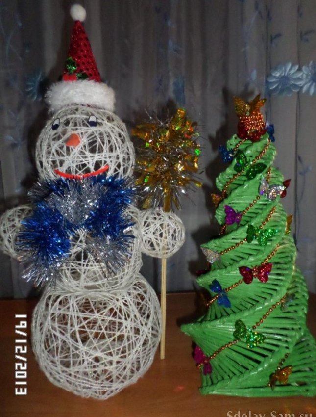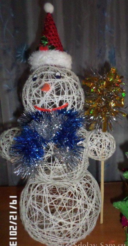 Супруга "слепила" снеговика к елочке. Рецепт "лепки" предельно прост. Берем воздушные шарики, надуваем их до определенных размеров, обматываем нитками, наносим клей. Как только вся консистенция застывает на шарике, используя острый предмет (в нашем случае иголка) лопаем шарик и аккуратно извлекаем его из полученого шара из ниток. Дальше все также просто. Состыковываем между собой "ниточные" шарики (по-моему супруга делала это нитками и клеем). Вырезаем из цветной (оранжевой) бумаги нос для зимнего гостя. Рисуем на обычной бумаге очи для того, чтобы снеговик приобрел зрение и вырезаем для него "улыбающийся рот". Шапочку снеговику пришлось приобретать в магазине. Наряжаем снеговика мишурой и награждаем его "рукодельной" метелкой. Вот в общем и вся наука. Ставим снеговика вместе с "газетной елкой" и ждем приближения Нового Года!