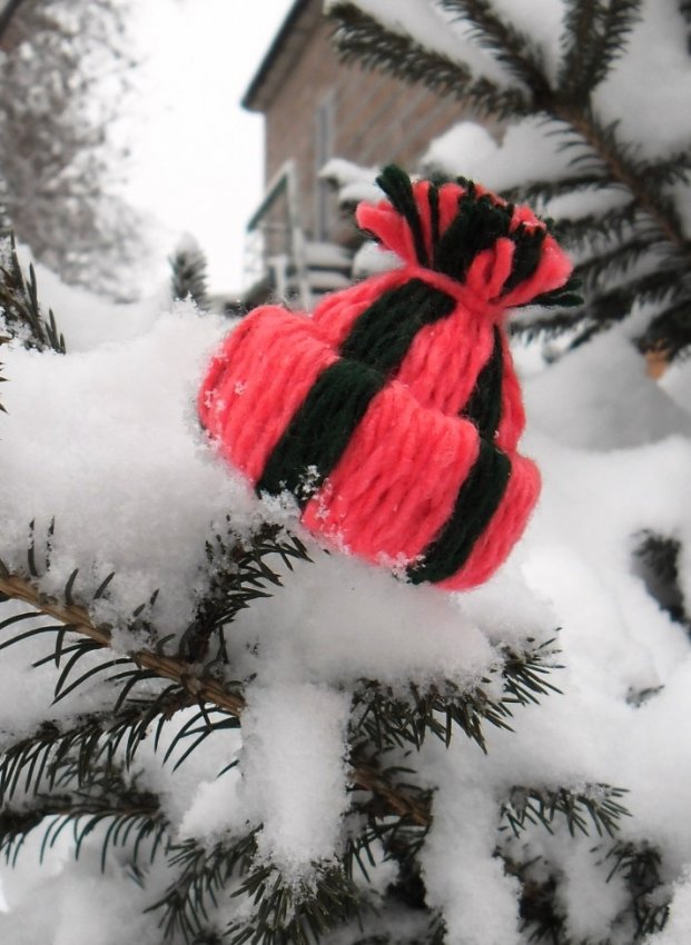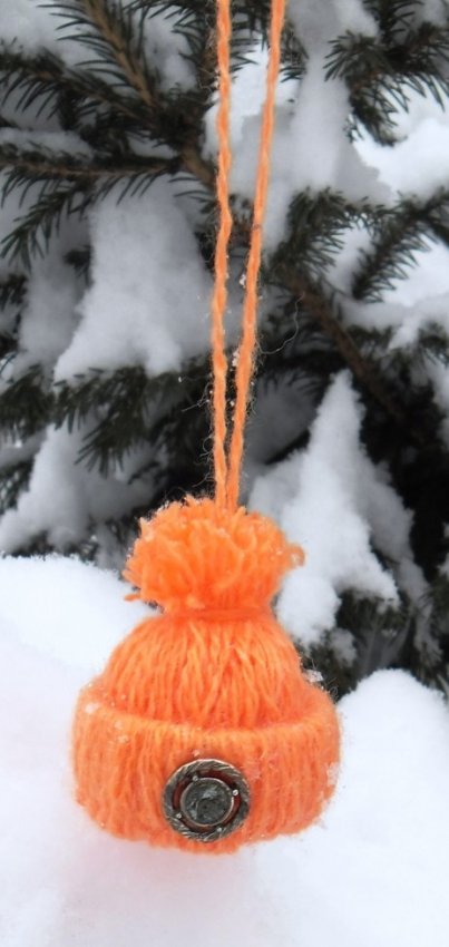 Перевязываем "макушку" крепко-накрепко. Отрезаем лишнее,формируем красивый помпон. Вроде всё,но не совсем. Продеваем через центр шапочки вязочку,а иначе как на ёлочку такую красоту повесить?.