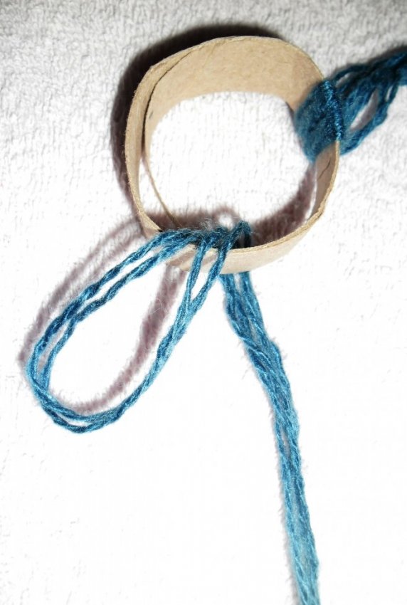 И начинаем пряжей обматывать картонное кольцо,да не абы как сикось-накось, а завязывая петли)