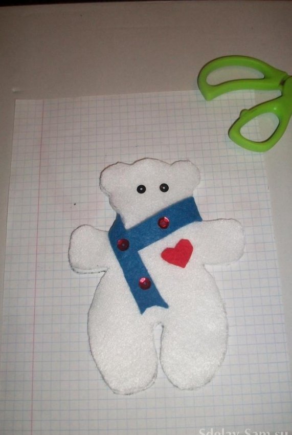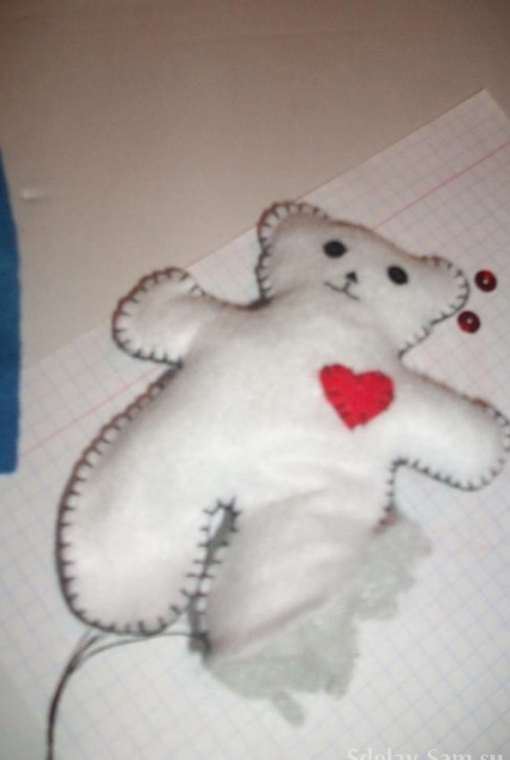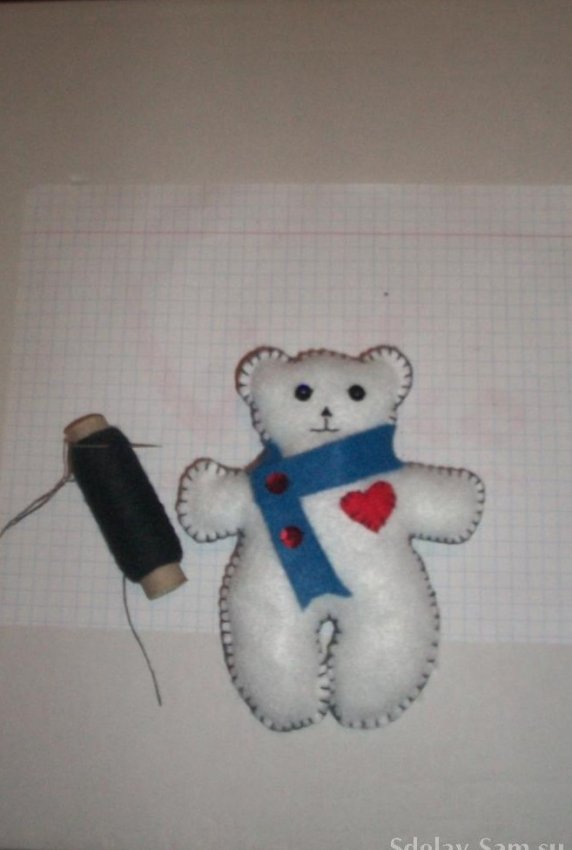 Шаг пятый. Из полосочки синего фетра делаем шарик. Примеряем и декорируем паетками красного цвета. Черными нитками вышиваем мордочку.