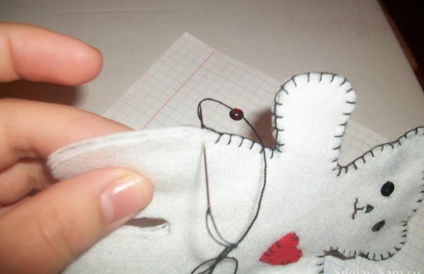 Шаг четвертый - вырезаем по ткани шаблон. Пришиваем две паетки вместо глаз и сердечко. Как видите, одна сторона остается белой, другая с глазами и сердцем.