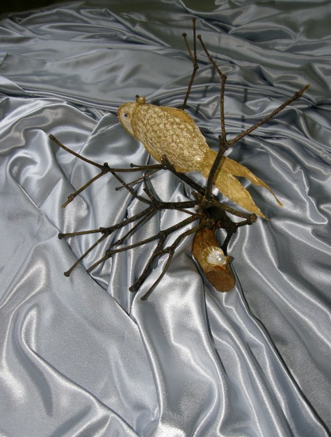 Золотая рыбка изготовлена из листьев кукурузы и семечек тыквы.