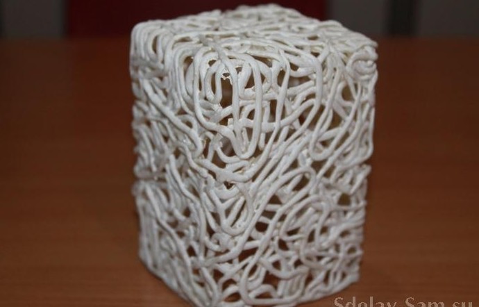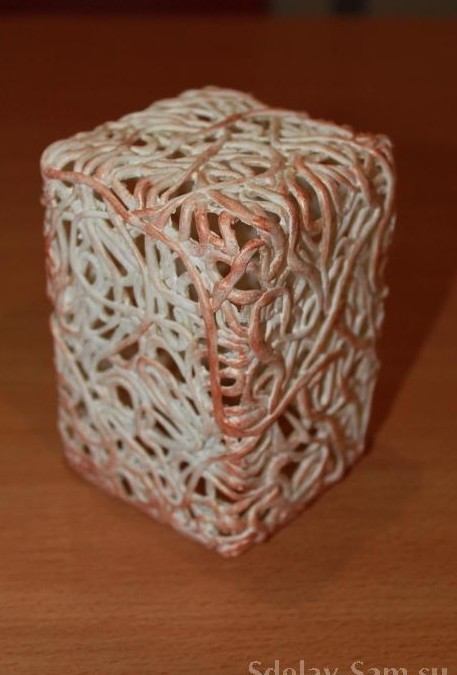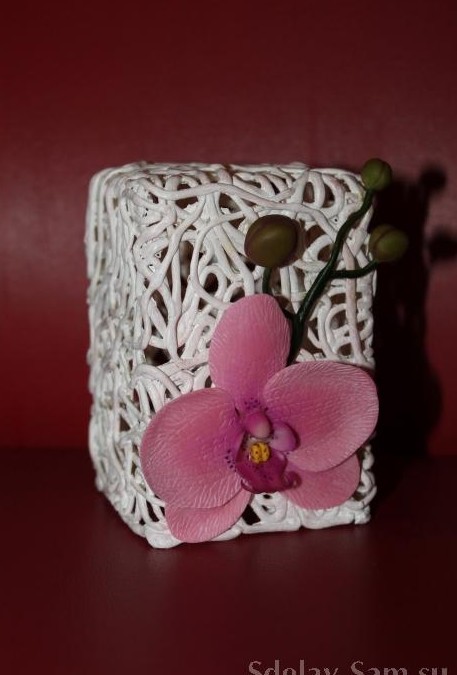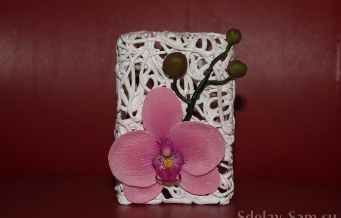 Здравствуйте! Буду рада поделиться с Вами идеей, как сделать красивую декоративную вазочку из полимерной глины. Шаг 1. Нам понадобиться: полимерная глина, латексный клей (можно клей ПВА), кисть, коробка из под сока или молока. Шаг 2. Берем небольшой кусочек полимерной глины (как показано на фото ниже) и раскатываем его в тонкую соломинку. Я специально сделала по толщине неровную соломинку, потому как это будет гораздо интереснее смотреться. Шаг 3. Теперь приступаем к наклеиванию соломинок из глины к основе. Берем соломинку и изгибаем ее в разные стороны, чтобы получался узор. Там где глина плохо держится нужно немного приклеить клеем. Там где будут пересекаться соломинки просто необходимо смазывать эти места клеем. Желательно выбирать основу с гладкой поверхностью, чтобы было не трудно отделить глину от основы Чем больше соломинок Вы сделаете, тем ажурнее будет смотреться вазочка. Не забывайте смазывать клеем места пересечения глины, иначе не получится сделать устойчивую и твердую вазочку. Теперь оставляем сушиться примерно на сутки, т.к. полимерная глина полностью высыхает за 24 часа. Шаг 4. Аккуратно отделяем основу от вазы. Я покрасила свою вазочку белой акриловой краской, потому как сама полимерная глина имеет не очень красивый цвет после высыхания. Вы можете покрасить в любой другой цвет. Вот еще один вариант покраски вазочки. Поскольку я занимаюсь керамической флористикой, решила прикрепить на вазочку веточку орхидеи из полимерной глины. Спасибо за внимание! С уважением, Дарья.