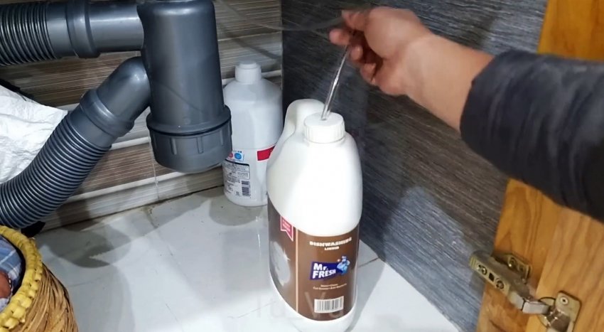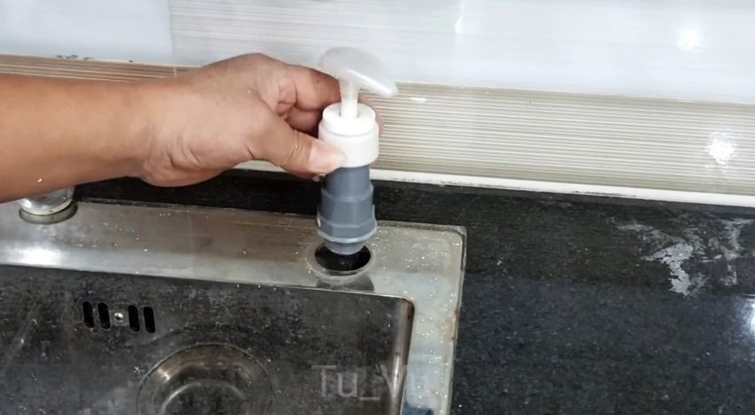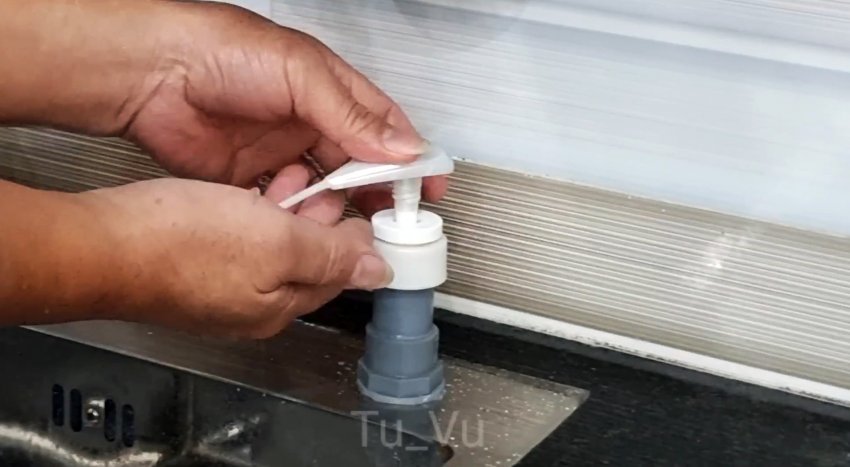 Переходник с внутренней резьбой надеваем под кухонной мойкой на пластиковую гибкую трубочку и закрепляем с его помощью дозатор на мойке. Конец трубочки опускаем в емкость с моющим средством или жидким мылом через соответствующее отверстие в пробке.