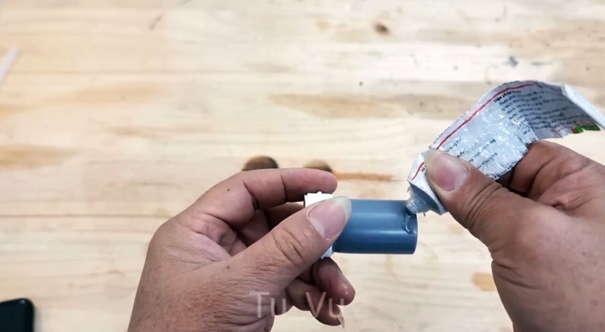 С помощью клея закрепляем резьбовое горлышко от емкости на подходящую по диаметру пластиковую трубу, длину которой нормируем ножницами по пластику.
