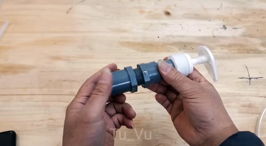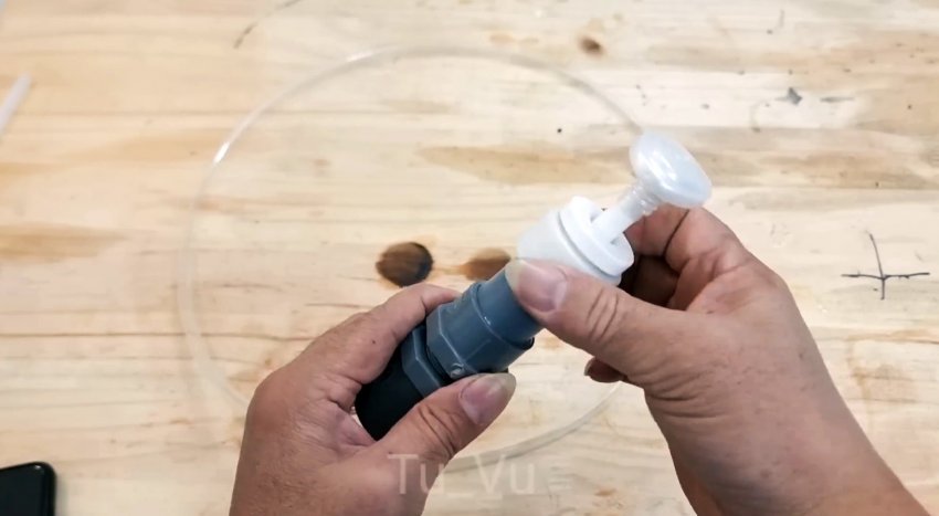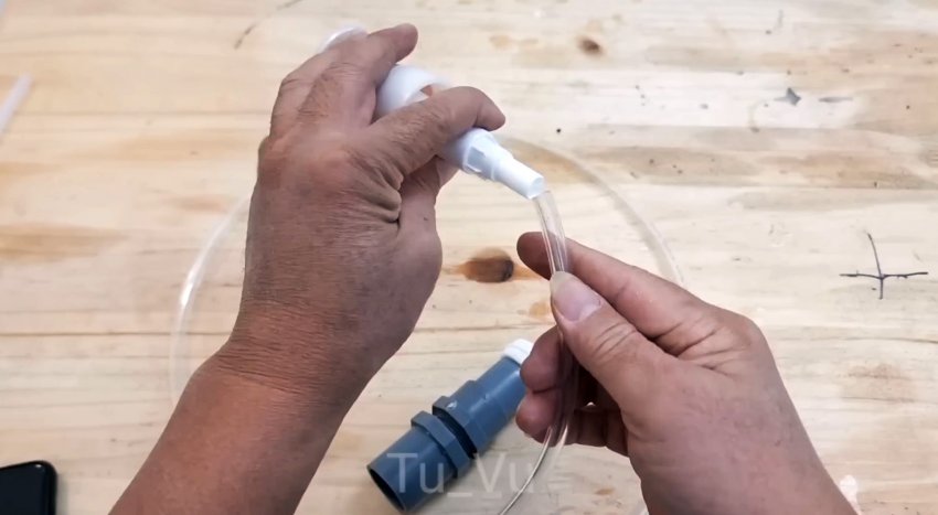 В пластиковую трубу со стороны горлышка от емкости вставляем дозатор и накручиваем его гайку на резьбу горлышка. На переходник с наружной резьбой накручиваем переходник с внутренней резьбой также их ПВХ. Выкручиваем дозатор и закрепляем с всасывающей стороны гибкую пластиковую трубку нужной длины.