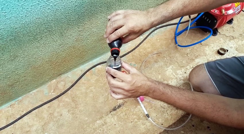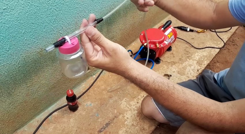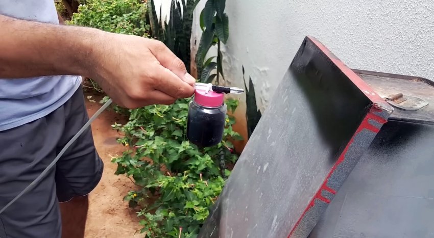 Подсоединяем конец ручки к шлангу компрессора, в баночку заливаем жидкую краску, включаем компрессор и закрываем пальцем верхнее отверстие. Краскопульт начинает работать.