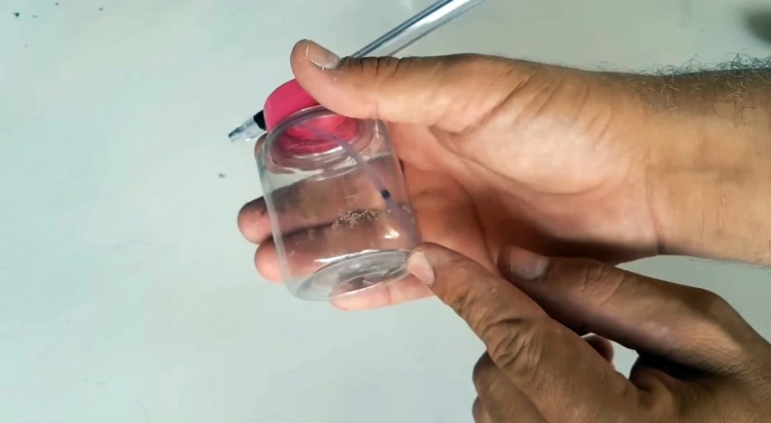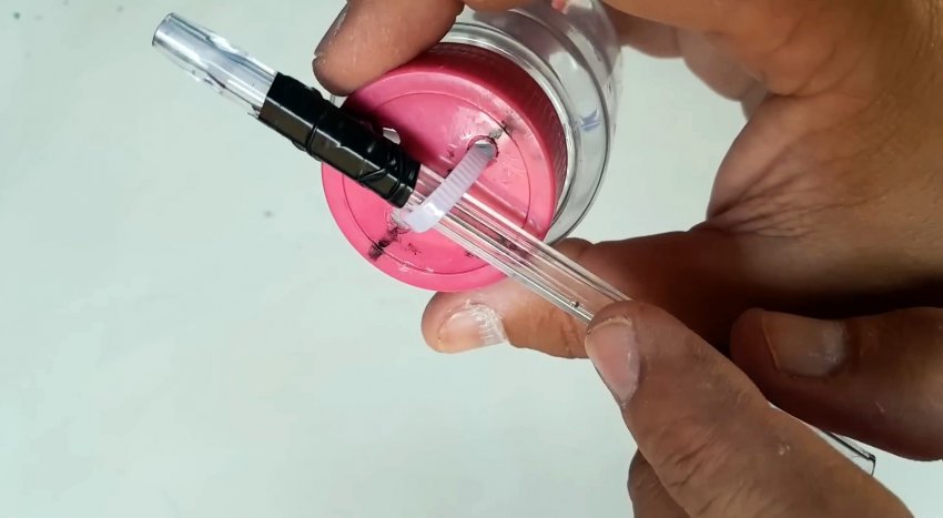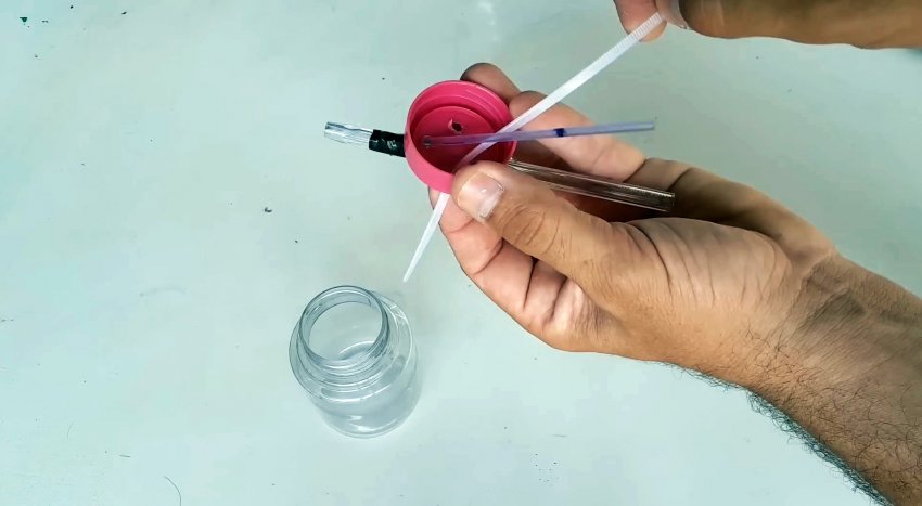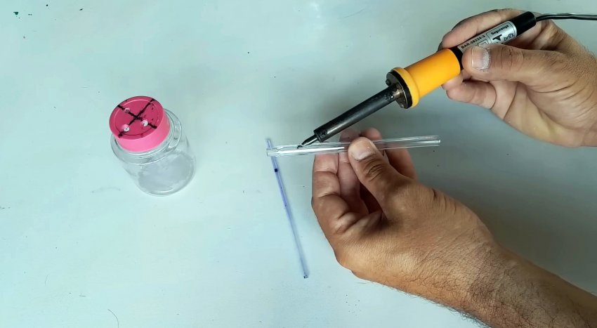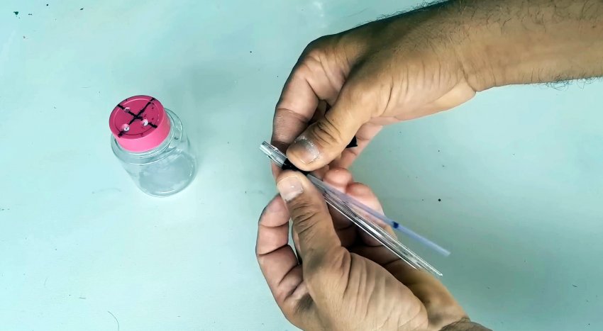 Укорачиваем пластиковый стержень, срезая его часть под углом так, чтобы конец немного не доставал до дна баночки. Это не допустит попадания в трубочку загрязнений и не приведет к ее забиванию.