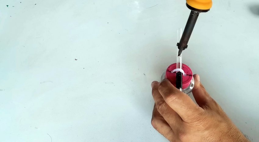 Просовываем гибкий стержень из пластика в отверстие, пока его конец не совпадет с торцом корпуса ручки. Место соединения этих двух деталей герметично обматываем изолентой.