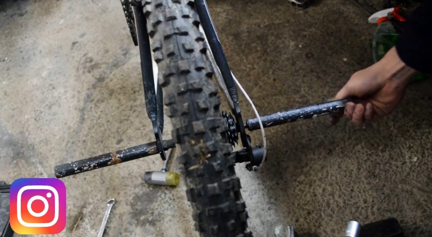 К задней оси велосипедного колеса с обеих сторон прикручиваем 2 отрезка из круглой трубы, которые будут выполнять роль подставок для ног.