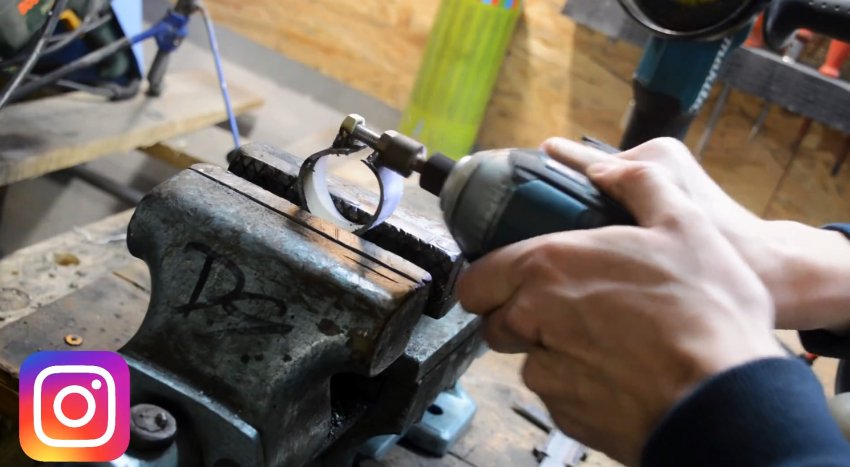 Над разрезом уменьшенного кольца поперек укладываем болт с двумя накрученными гайками и привариваем их к концам кольца. В результате получаем хомут со стягивающим болтом.