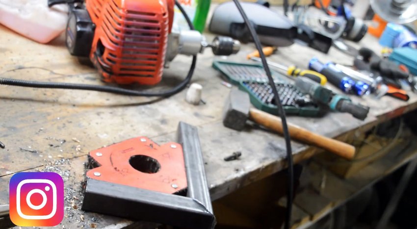 Бензобак закрепляем двумя болтами к отдельно собранному кронштейну, который привариваем к вертикальной квадратной трубе обвязки основания мотора.