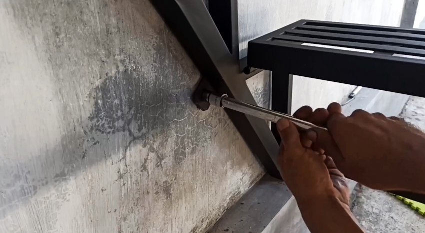 Устанавливаем лестницу в нужном месте и крепим мощными саморезами к стене, используя отверстия в крепежных ушках.