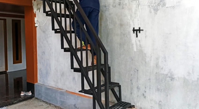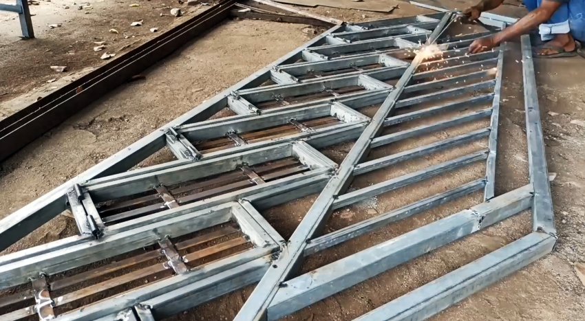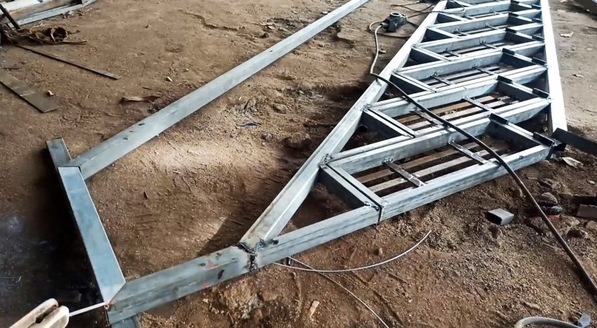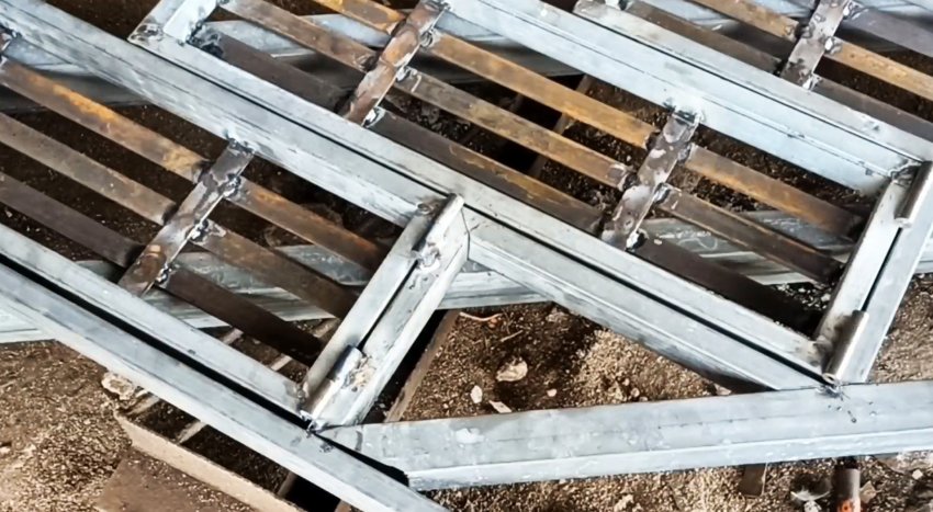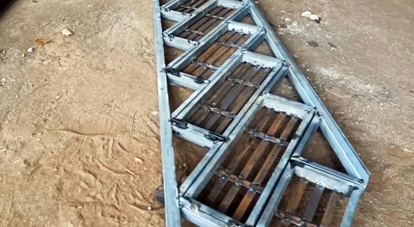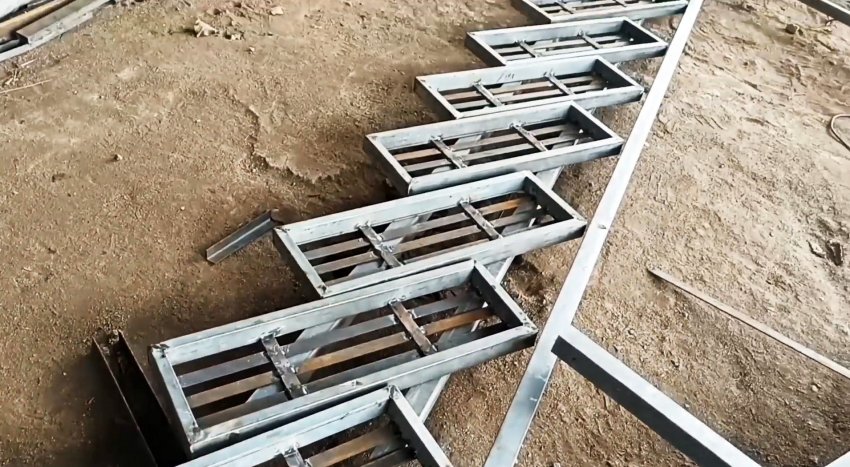 Изготавливаем необходимое количество рам, укладываем их под строго определенным углом на 2 направляющие также из профильных труб прямоугольного сечения и в соответствии с проектной высотой ступеней лестничного марша.