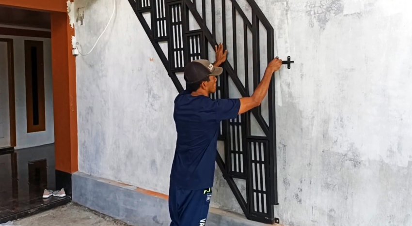 В расчетном месте крепим к стене фиксатор, который будет удерживать лестницу в сложенном положении. Для установки лестницы в рабочее положение отодвигаем фиксатор и опускаем основание лестницы на пол. При этом ступени занимают горизонтальное положение, а перила – вертикальное.