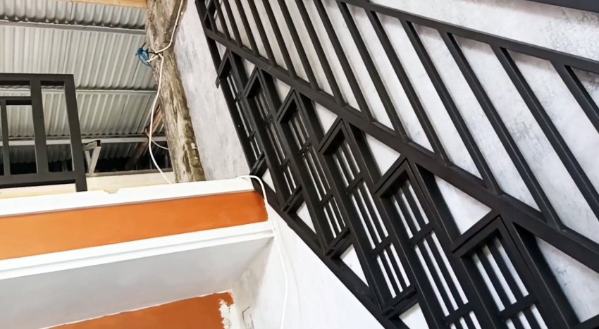 К одной из направляющих привариваем конструкцию, состоящую из тех же профильных труб определенной длины и положения, но с заполнением из профильных труб меньшего сечения. Она будет выполнять функцию лестничных перил. К меньшей стороне упорного угла под второй снизу рамы привариваем С-образную ручку.
