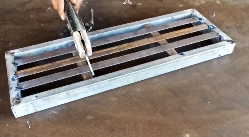 Чтобы рамы могли полностью выполнять функцию ступеней, привариваем в продольном направлении на равном расстоянии и параллельно друг другу 3 стальные полосы, которые с обратной стороны усиливаем двумя поперечными полосами, приваренными на расстоянии 1/3 и 2/3 от одной их коротких сторон.
