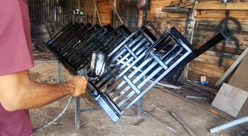 К нижней направляющей привариваем 4 ушка и приступаем к шлифовке сварочных швов. Далее окрашиваем лестницу в нужный цвет с помощью краскопульта.