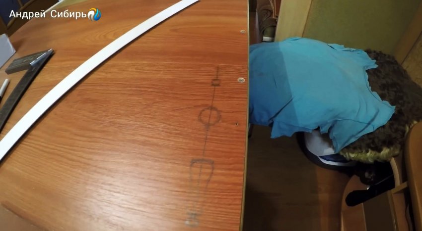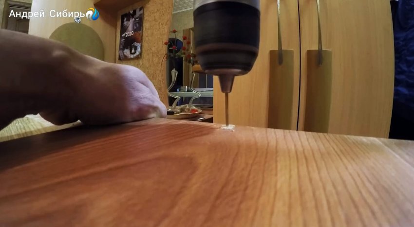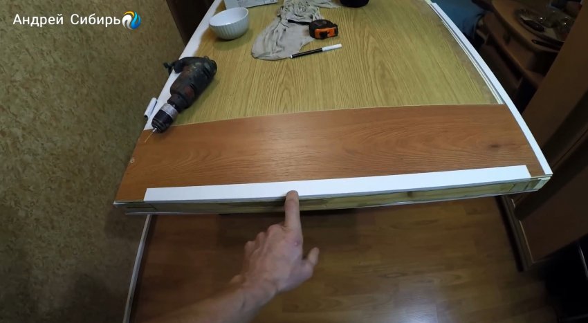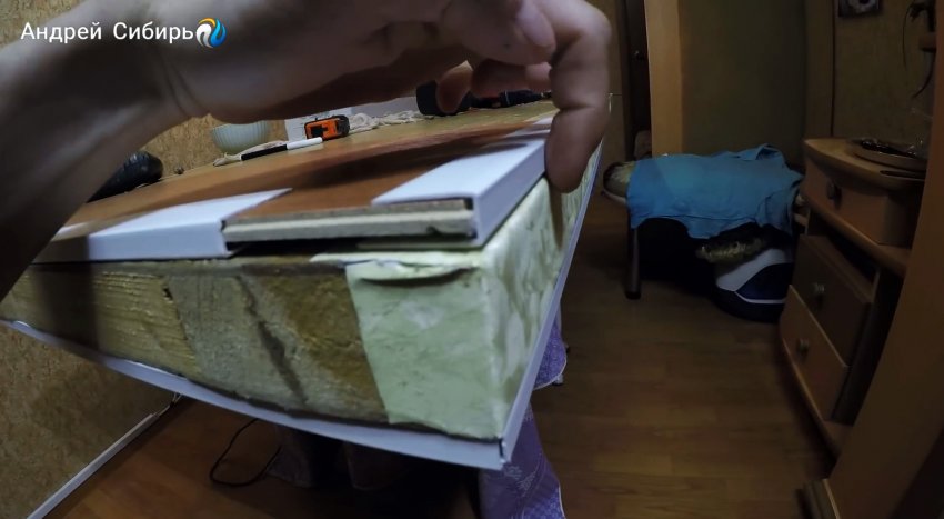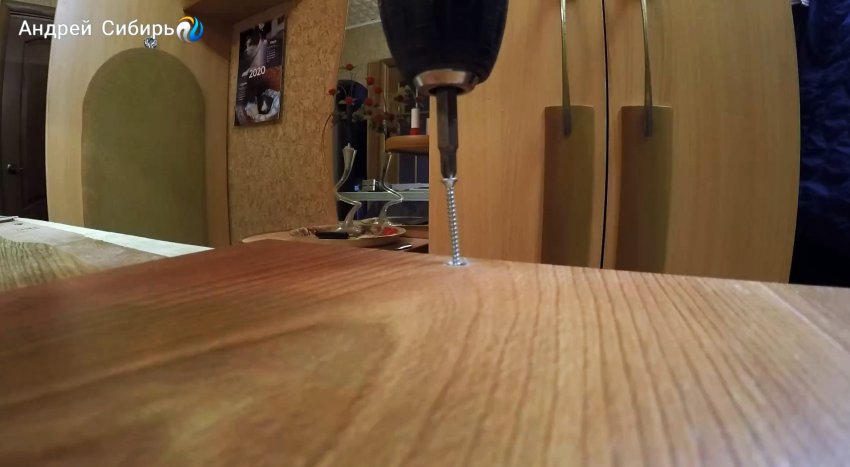 С двух краев доски ламината по центру, отступив от края 10 мм, сверлим отверстия и вход в них рассверливаем битой под головку саморезов. Метизы закручиваем без фанатизма, т. к. их еще придется слегка ослаблять.