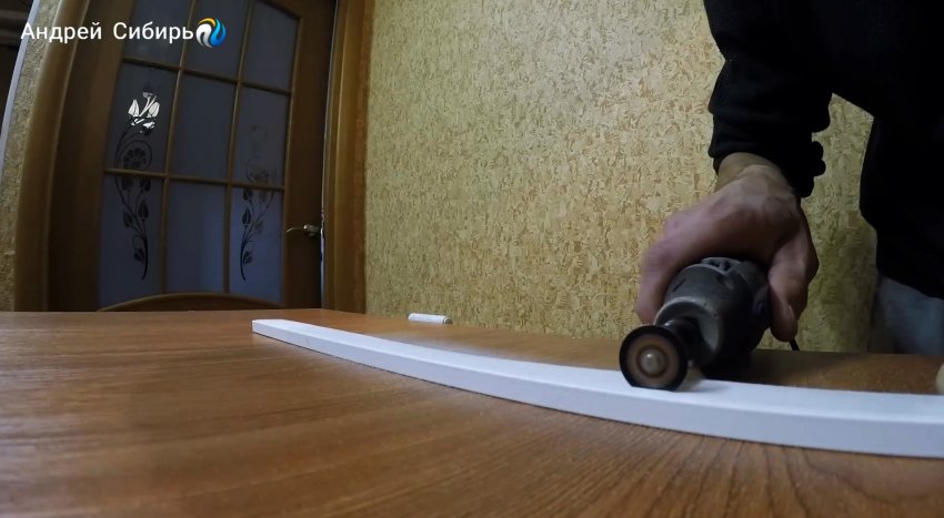 Закончив обшивку двери ламинатом с одной стороны, по контуру дверного полотна устанавливаем пластиковые П-образные заглушки. Для этого в продольном направлении отрезаем дремелем полосу, оставляя у основания заглушки полоску шириной 5 мм, которую и подсовываем под ламинат, выкручивая поочередно шурупы на толщину укороченной стороны заглушки.