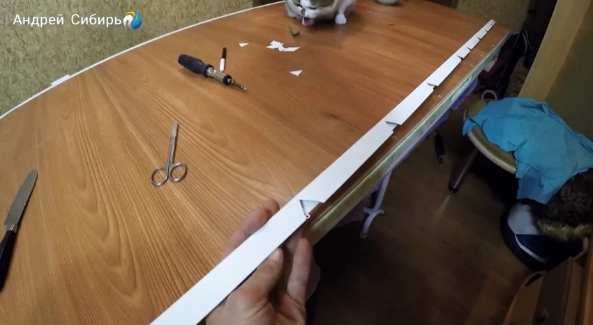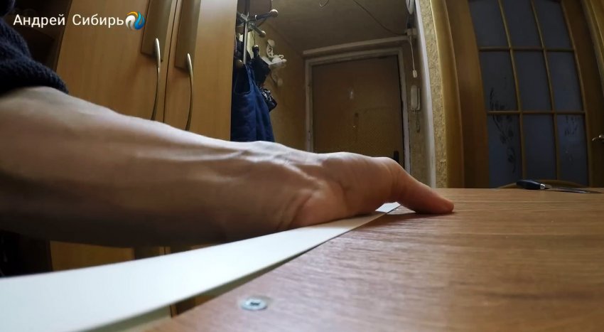 Со стороны двери без навесов установка заглушки происходит несколько по-другому. Переворачиваем заглушку, размещаем ее над ламинатом так, как она будет окончательно установлена, и вырезаем треугольные пазы напротив каждого самореза, чтобы при установке заглушки на кромку двери она не упиралась в саморезы. Торцевые заглушки устанавливаем аналогично внахлест или под угол 45 градусов.