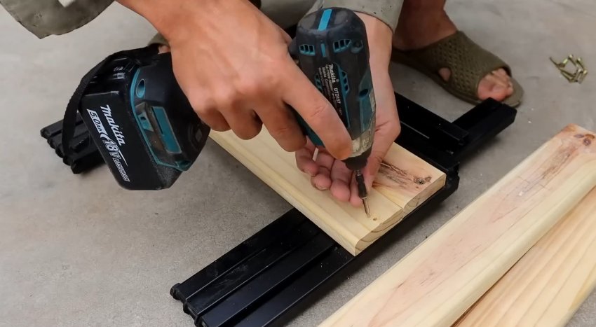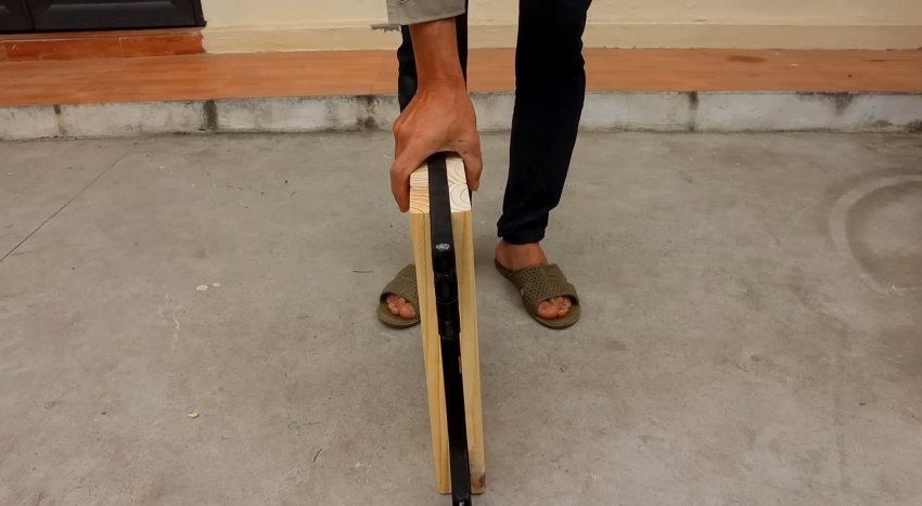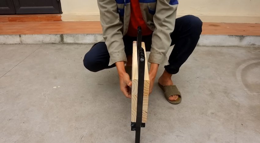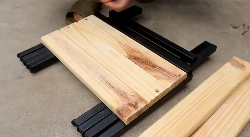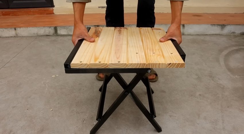 Прикручиваем к металлическому каркасу саморезами деревянные элементы сидения, предварительно просверлив в них по краям отверстия. Стул легко раскладывается, обладает достаточной прочностью и жесткостью, просто собирается, и при этом занимает мало места.