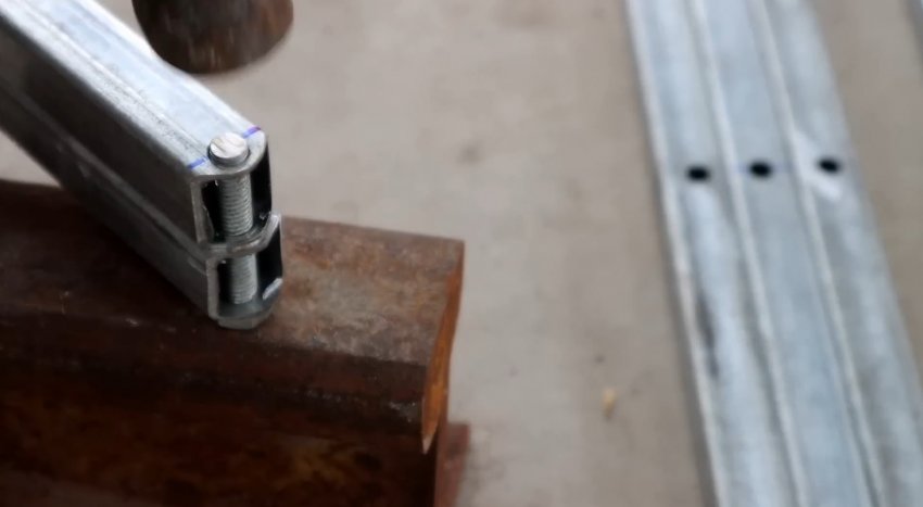 Отрезаем выступающие части болтов, оставляя лишь небольшую часть, которую развальцовываем молотком, но при этом оставляем соединение подвижным. 2 оставшиеся пары также соединяем болтами, но между отрезками помещаем гайки.