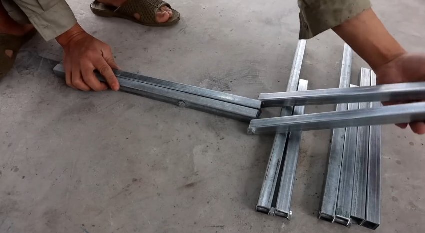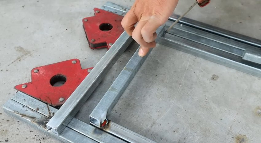 Точно также укладываем на свободные концы отрезков длиной 30 см в поперечном направлении отрезок квадратной трубы и привариваем с обеспечением прямых углов в местах сварки.