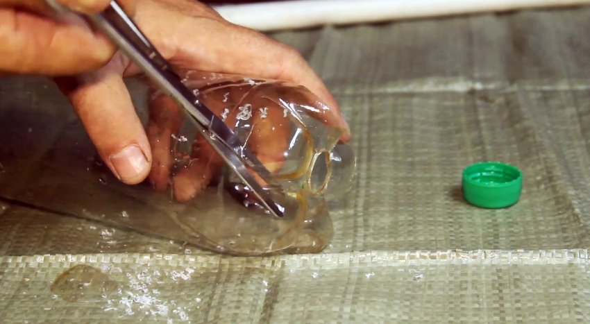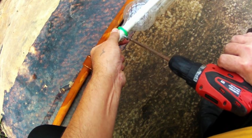 Сверлим в дне пластиковой бутылки отверстие. Используя ножницы или бормашинку, делаем несколько технологических отверстий в дне бутылки. Не рекомендуется отрезать дно бутылки полностью. Если при прочистке опуститься ниже обсадной трубы, то бутылка может зацепиться за нее или застрять.
