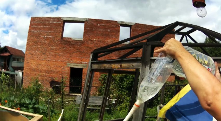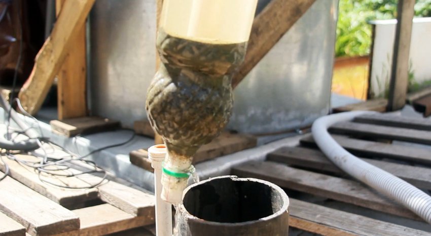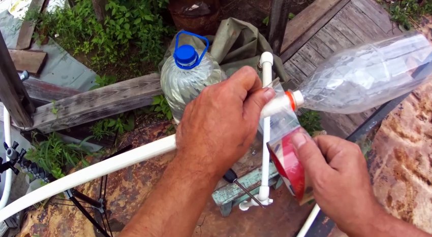 Вставляем один конец трубы в бутылку и фиксируем ее на трубе шурупами.