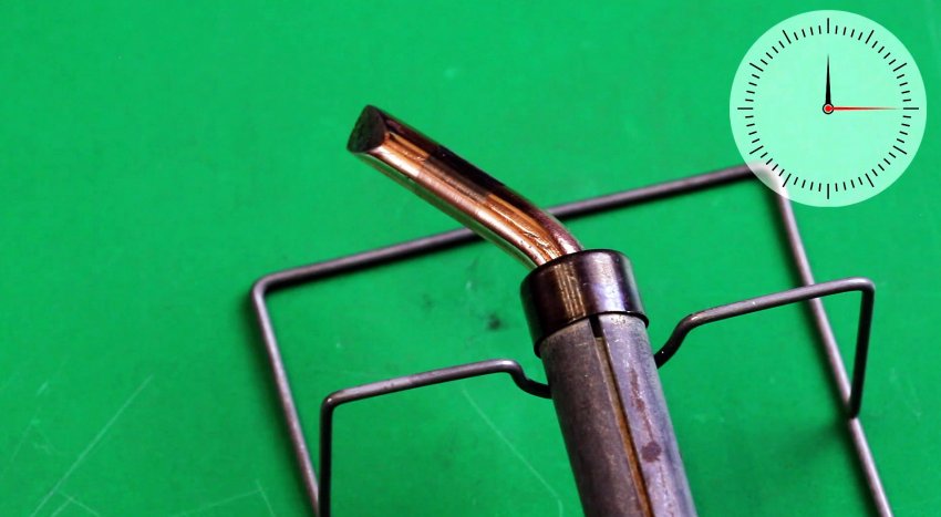 Укладываем паяльник на подставку, включаем его в сеть и ждем, что получится. Внешние изменения становятся заметны уже через 10-15 минут. Имитация продолжительной работы путем многократных циклов нагрева и остывания дают свои результаты.