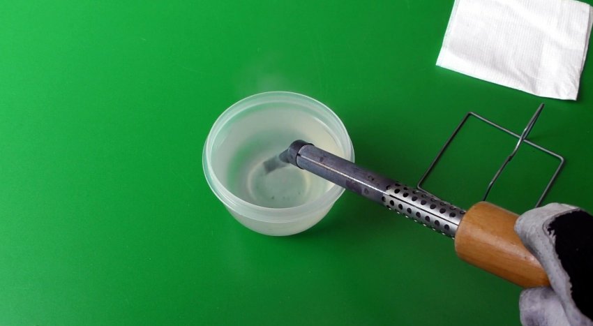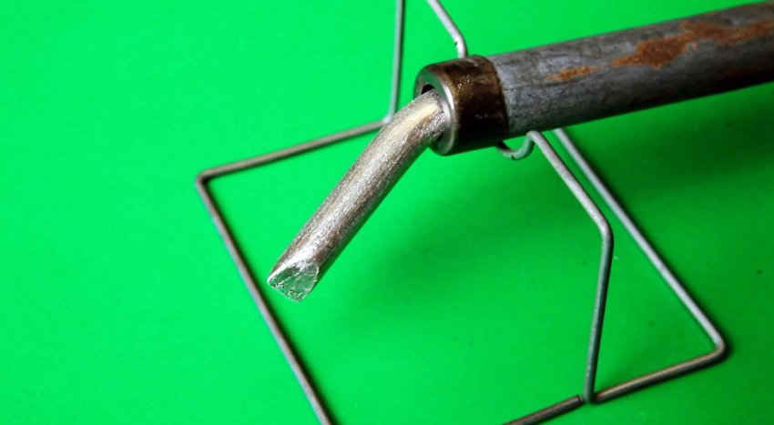 Далее для удобства и чистоты эксперимента соорудим простейшую подставку для паяльника из проволоки, изгибая ее с помощью пассатижей, и используя в качестве измерителя и шаблона бумажный лист квадратной формы заданных размеров.
