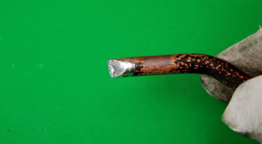 Осушаем жало бумажной салфеткой и под слоем окалины наблюдаем следующее. Лучший результат показал алюминий. Но обработка алюминием больше актуальна для паяльников с тонким жалом. Если жало толстое, то процесс втирания алюминия превращается в трудоемкий процесс, но это того стоит.