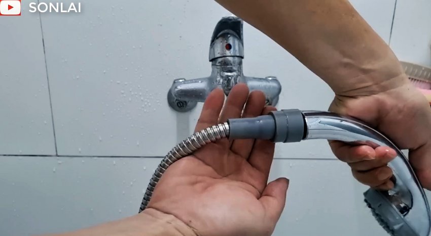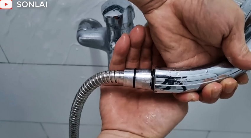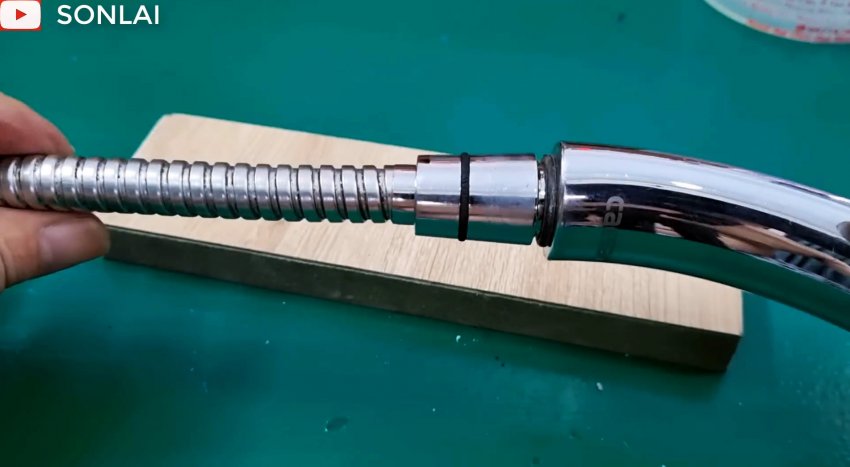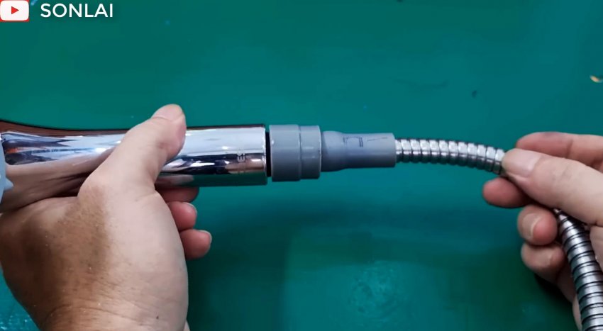 Вставляем в накидную гайку уплотнительную прокладку и навинчиваем ее на резьбу лейки. Второй конец шланга соединяем подобной гайкой со смесителем. Включаем воду и убеждаемся, что ремонт произведен качественно.