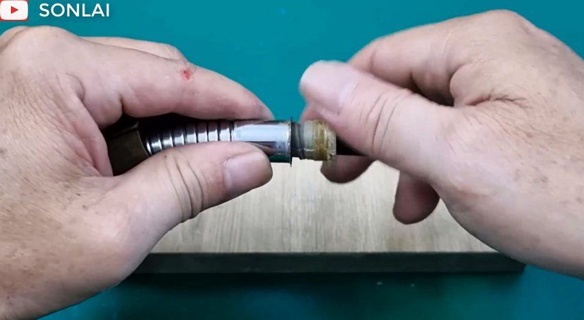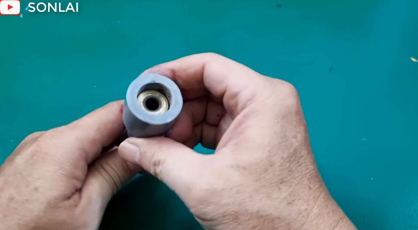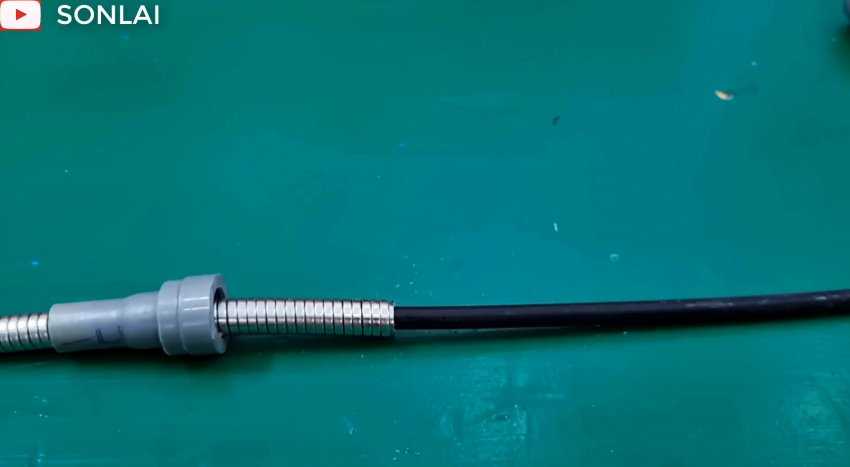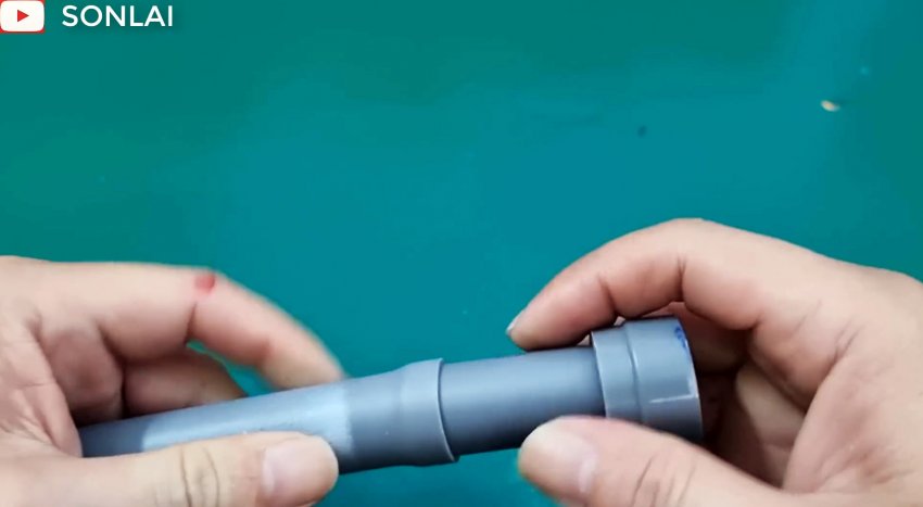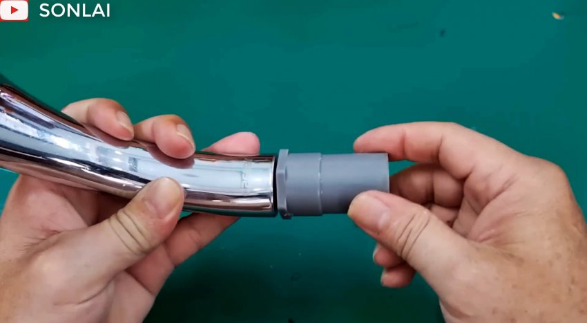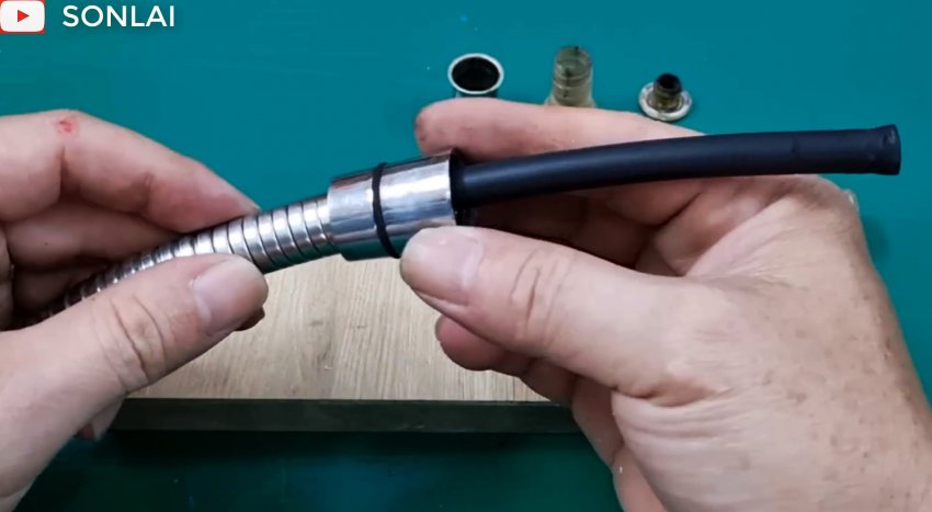 Вытаскиваем внутреннюю трубу из наружной и вставляем ее в наружную с другого конца, чтобы также сформировать на ней раструб, который вставляем в часть соединителя, и полученный узел надеваем на шланг трубой вперед.