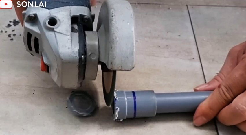 Согласовываем соединитель с длиной резьбы на лейке и по меткам распиливаем его в двух местах болгаркой. Зачищаем плоскость реза наждачной бумагой.
