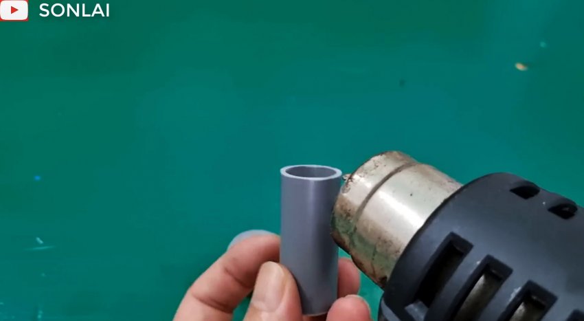 Подогреваем конец еще одного куска той же пластиковой трубы и надеваем его на трубу, вставленную в часть соединителя для получения раструба.