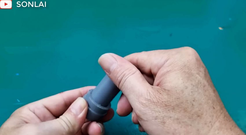 Отрезаем от пластиковой трубы кусок длиной 5 см, подогреваем конец и вход в часть соединителя без резьбы, и соединяем их.