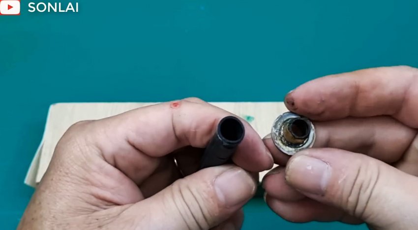 Отрезаем треснутый или разорванный конец внутренней трубки и впрессовываем втулку с фиксирующими ребрами в обновленный конец восстанавливаемой трубки.
