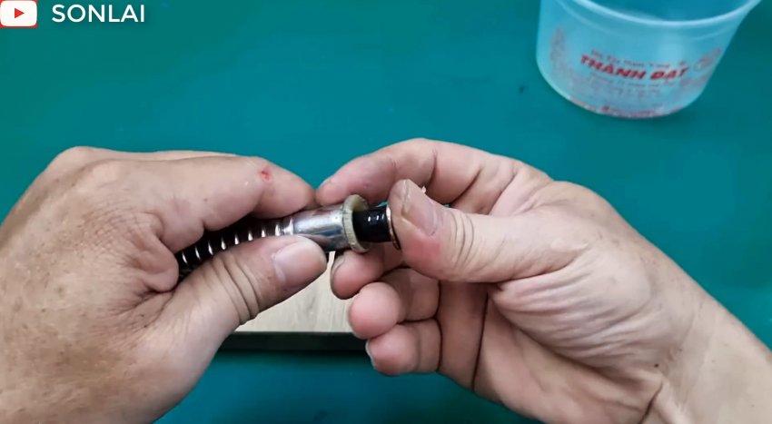 Придерживая пальцами наружную втулку, выкручиваем промежуточную с резьбой и также убираем в сторону вместе с наружной втулкой. Теперь появляется возможность удалить негодную накидную гайку со шланга.