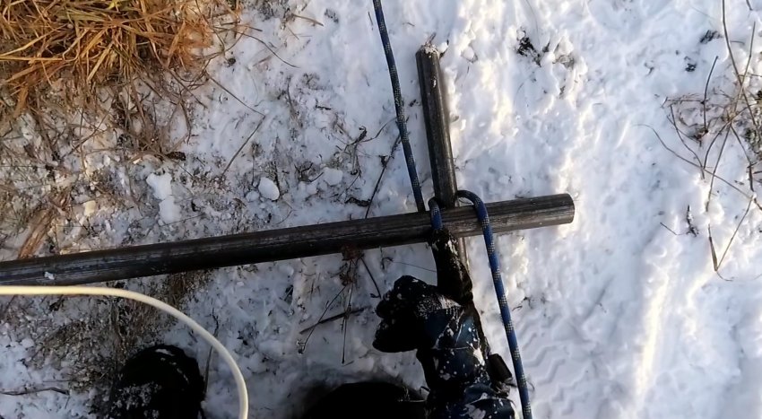 Примерно посередине подтягиваем веревку к себе, укладываем один рычаг параллельно веревке, а другой – поперечно на веревку и нижний рычаг, причем ближе к их краям. Намотку веревки на верхний рычаг осуществляем со стороны, которая длиннее.