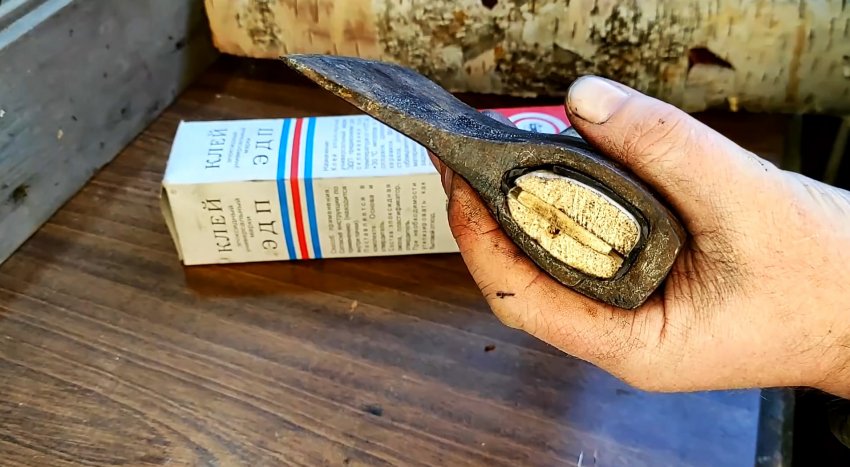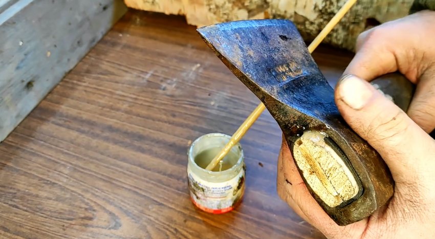 Для большей надежности все щели и пустоты между проушиной топора и топорищем заполняем двухкомпонентным эпоксидным клеем со всех сторон. После того, как клей затвердеет, топор готов к употреблению по своему основному назначению безо всяких ограничений.