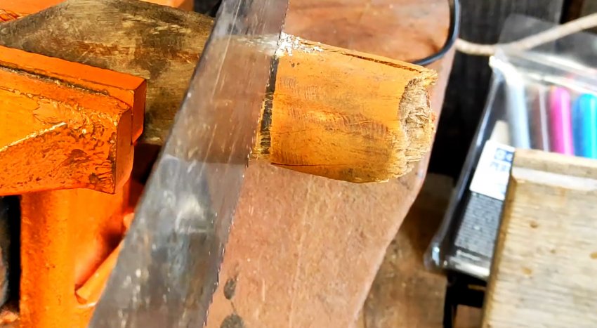 Затем размечаем место под будущий клин и делаем продольный запил посередине сечения торца рукояти с помощью той же ручной ножовки примерно на глубину ширины обуха головки топора или чуть меньше.